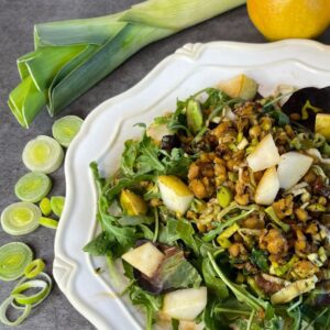 This tasty salad is an ode to the Fall season, and shines with flavor. When you’re short on time and dinner ideas, this crisp medley featuring pears, leeks and crumbled tempeh is balanced and delicious! You can check out a version with salmon here!